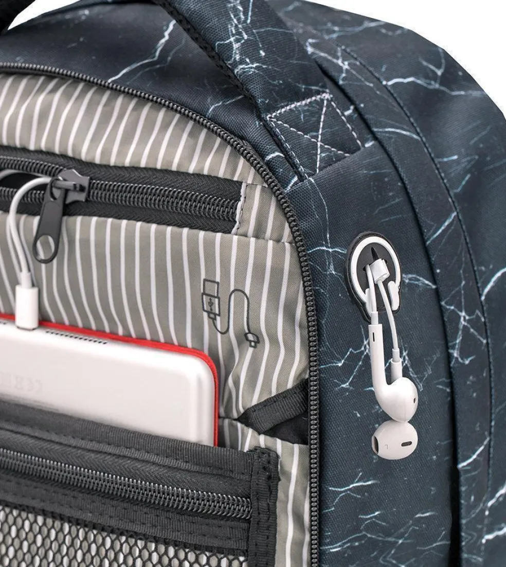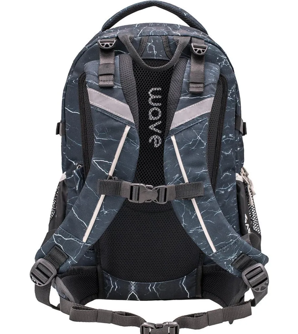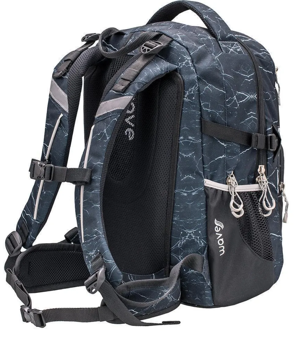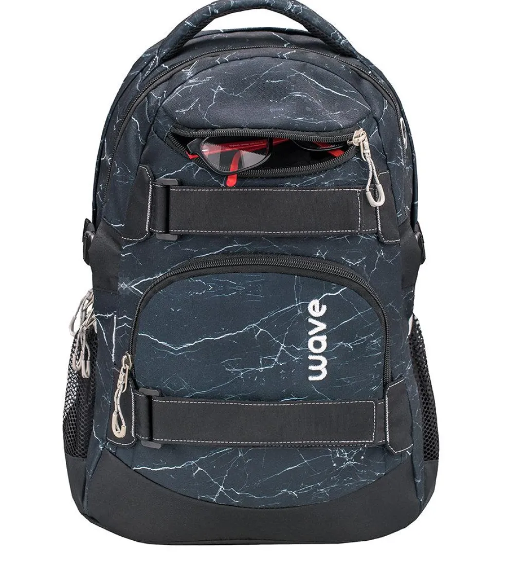 Wave Infinity wiegt nur ca. 1000 g und bietet genügend Platz für all deine Schulutensilien. Im inneren befinden sich zwei große Hauptfächer. Eines der großen Hauptfächer bietet ein gepolstertes Einsteckfach für den Laptop (15,6″) oder das Tablet (10″), zusätzlich findest du hier eine kleine Reißverschlusstasche und 2 elastische Taschen. Am vorderen oberen Bereich des Rucksackes gibt es ein „Brillenfach“. Die Riemen an der vorderen Seite des Rucksackes bieten dir die Möglichkeit deine Jacke oder dein Skateboard zu befestigen.