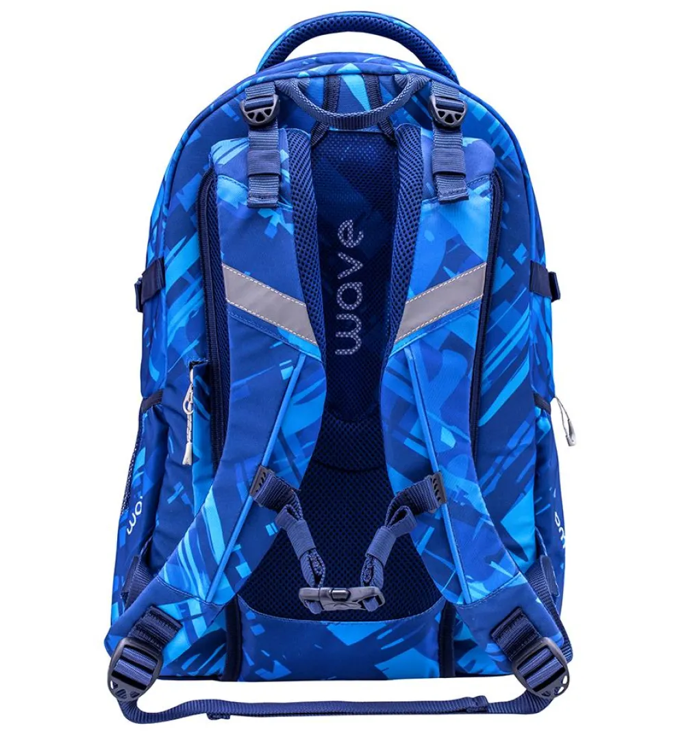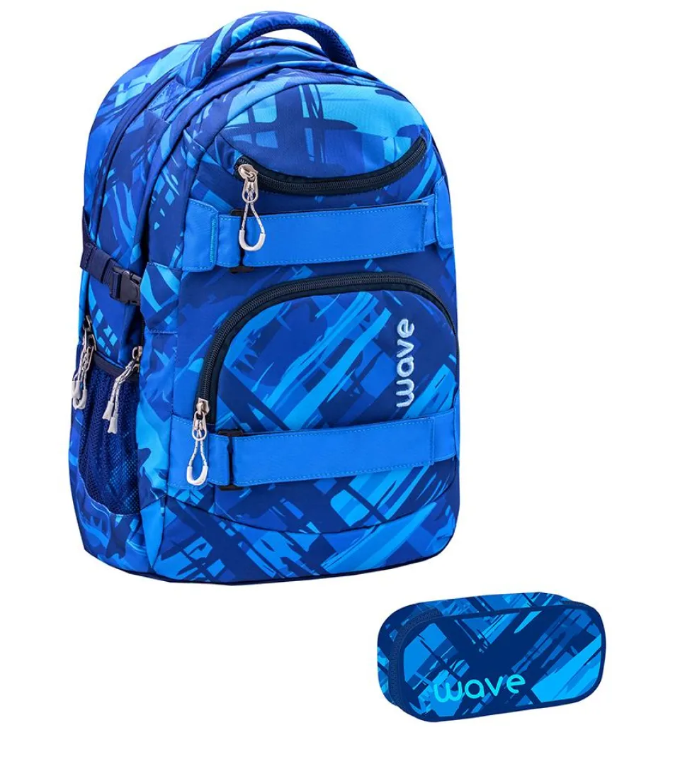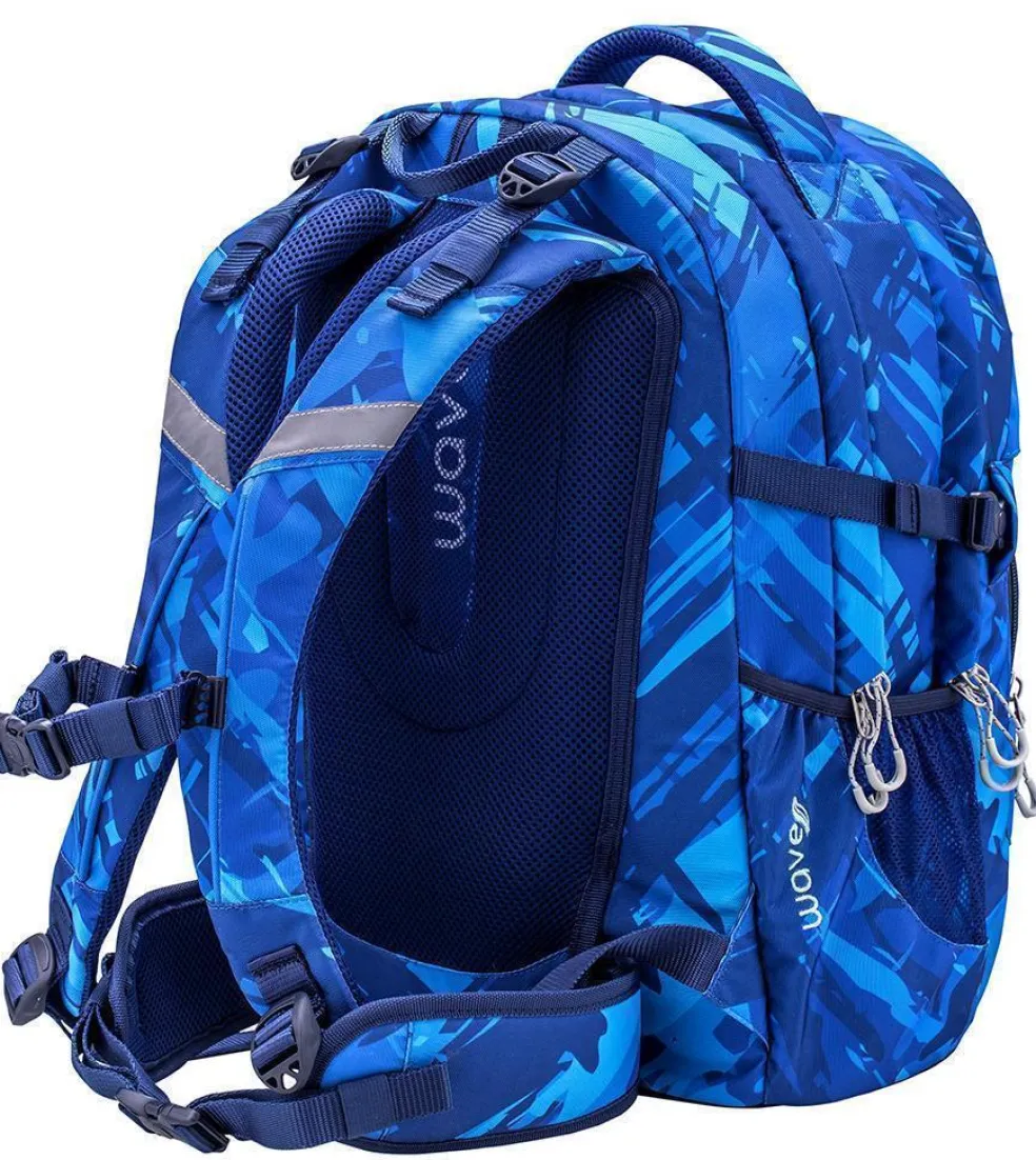 Wave Infinity wiegt nur ca. 1000 g und bietet genügend Platz für all deine Schulutensilien. Im inneren befinden sich zwei große Hauptfächer. Eines der großen Hauptfächer bietet ein gepolstertes Einsteckfach für den Laptop (15,6″) oder das Tablet (10″), zusätzlich findest du hier eine kleine Reißverschlusstasche und 2 elastische Taschen. Am vorderen oberen Bereich des Rucksackes gibt es ein „Brillenfach“. Die Riemen an der vorderen Seite des Rucksackes bieten dir die Möglichkeit deine Jacke oder dein Skateboard zu befestigen.