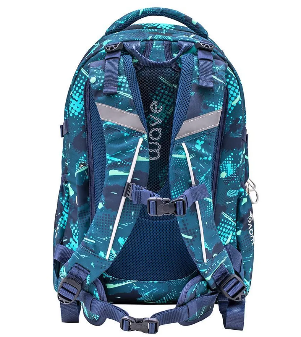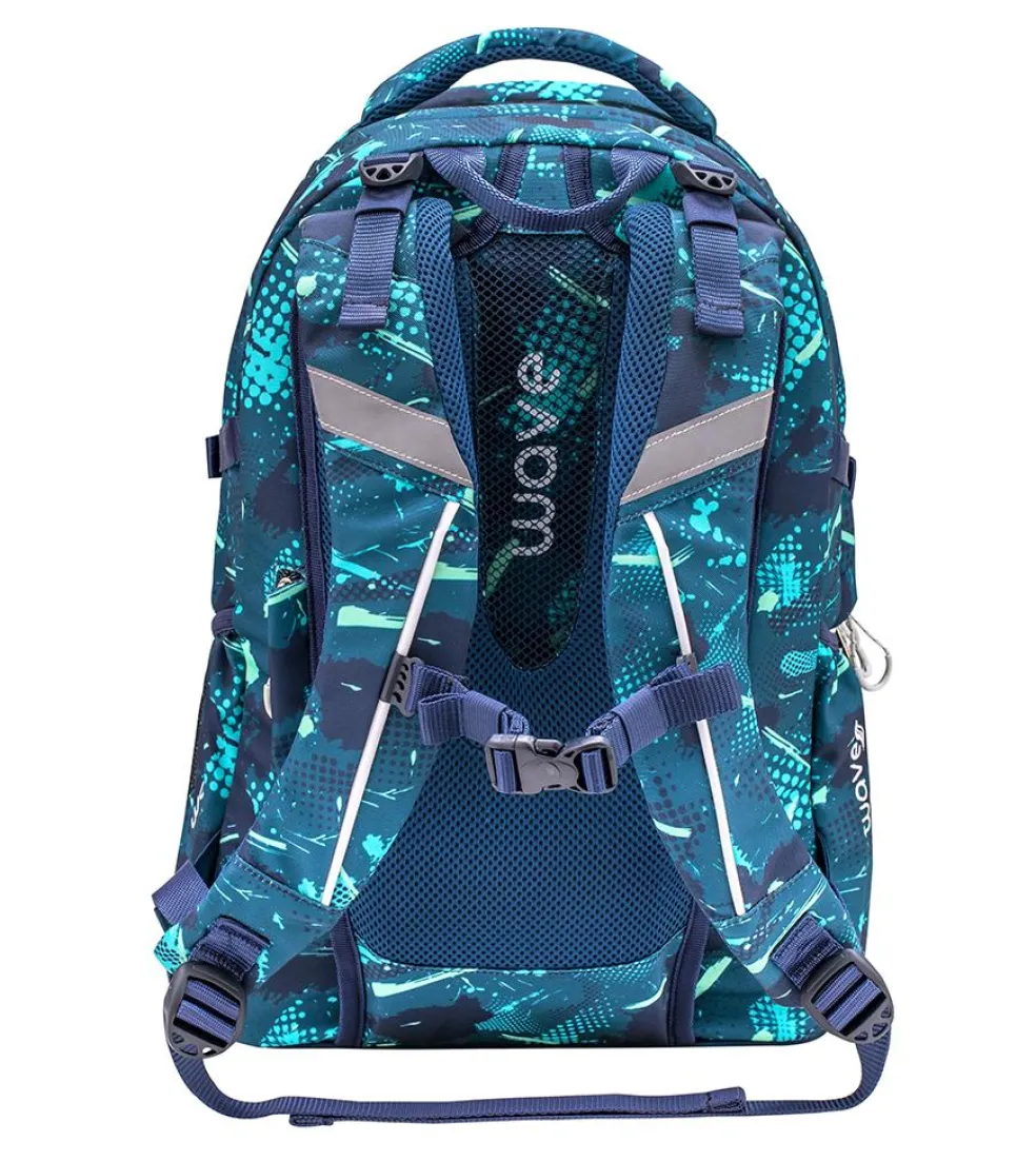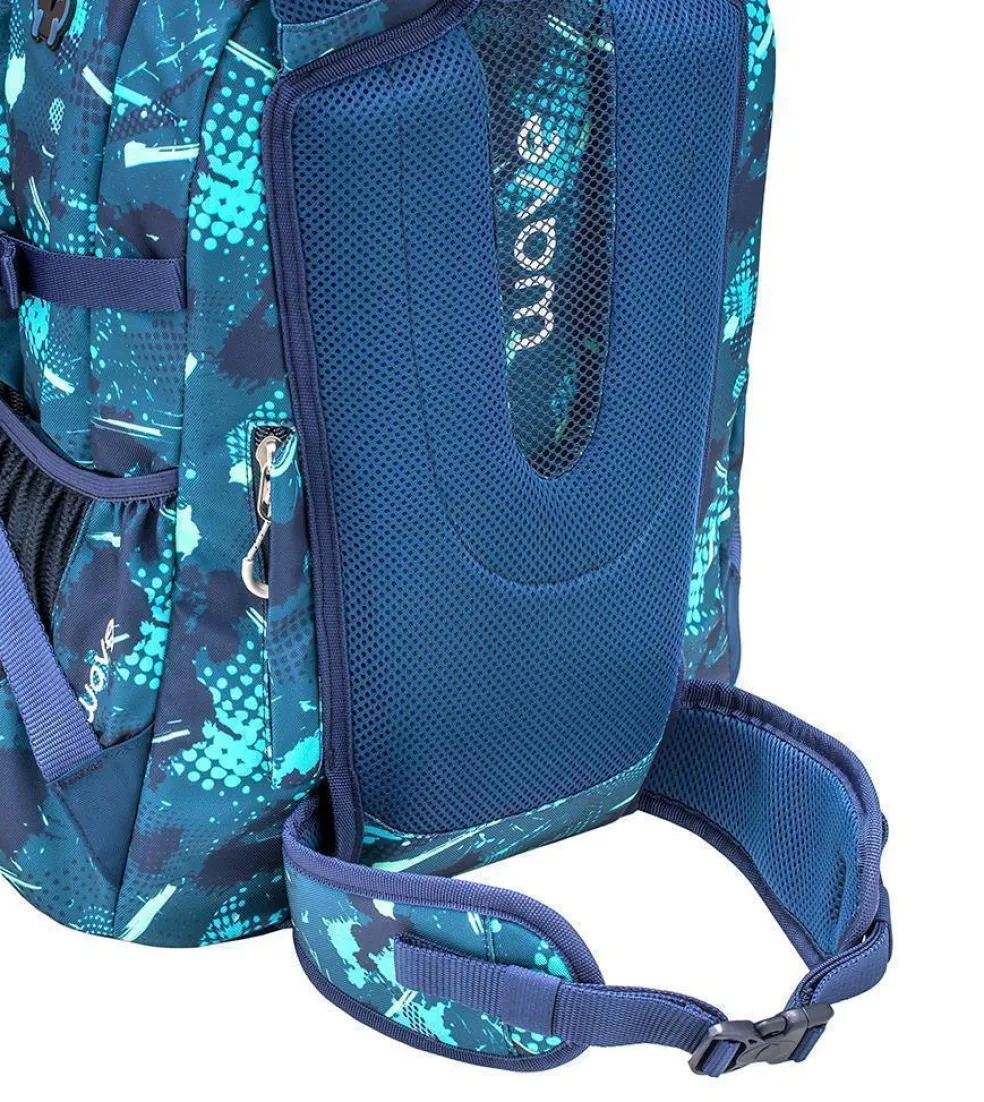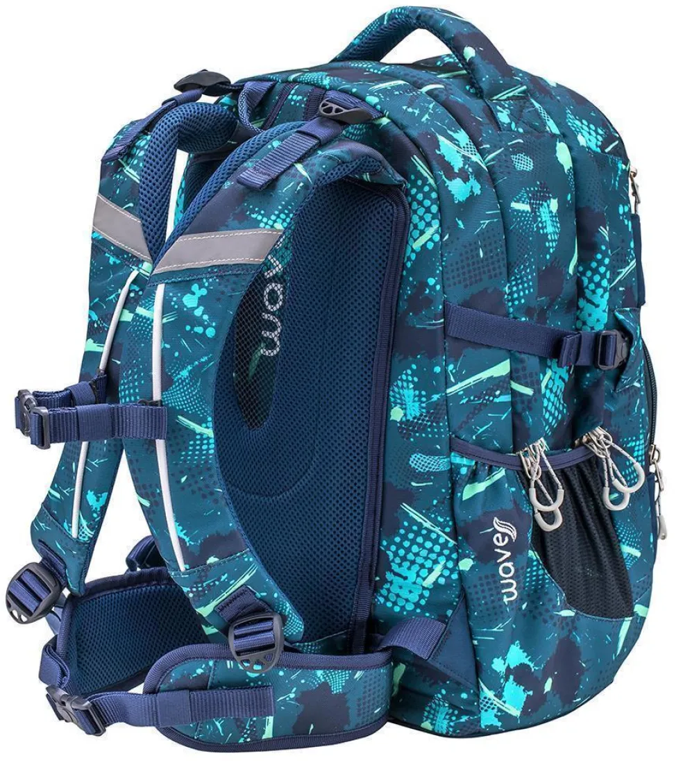 Wave Infinity wiegt nur ca. 1000 g und bietet genügend Platz für all deine Schulutensilien. Im inneren befinden sich zwei große Hauptfächer. Eines der großen Hauptfächer bietet ein gepolstertes Einsteckfach für den Laptop (15,6″) oder das Tablet (10″), zusätzlich findest du hier eine kleine Reißverschlusstasche und 2 elastische Taschen. Am vorderen oberen Bereich des Rucksackes gibt es ein „Brillenfach“. Die Riemen an der vorderen Seite des Rucksackes bieten dir die Möglichkeit deine Jacke oder dein Skateboard zu befestigen.
